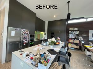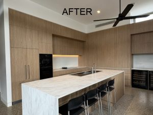 This kitchen sits within a striking, architect-designed home defined by soaring 3.6‑metre ceilings and bold materiality. While visually impressive, the original layout lacked everyday practicality. The overhead cabinetry stretched beyond reach & the black internal finishes made even the simplest items difficult to locate. Storage was inefficient, the oven had been poorly installed & the dark, heavy joinery felt disconnected from the otherwise light-filled, open-plan interior. Despite the home’s architectural acclaim, the kitchen was a clear failure in functionality. It needed to be accessible & genuinely tailored to the way the owners live each day.