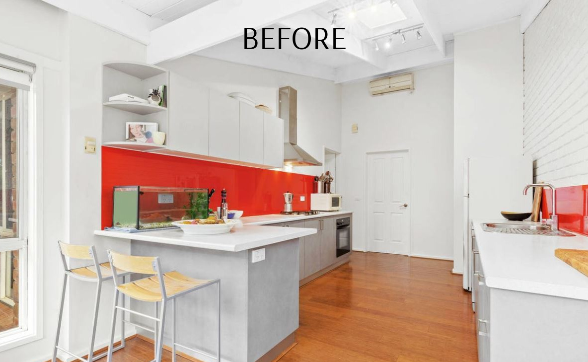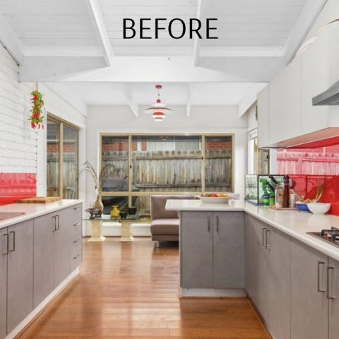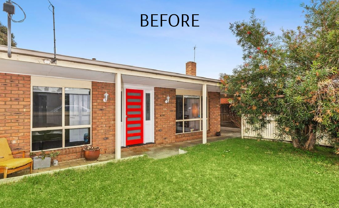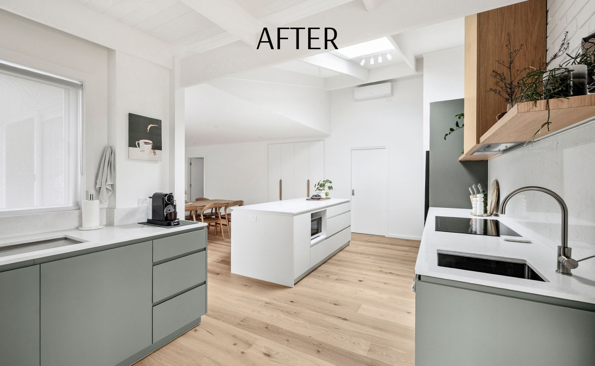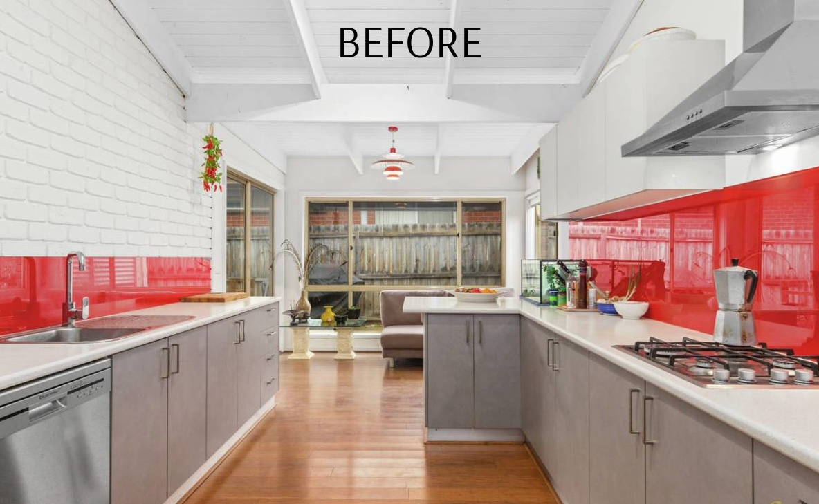 Transform a dated 1980s brick veneer complete with a curious floor plan & a previous renovation featuring traffic-stopping red, into a light-filled, open-plan coastal haven.