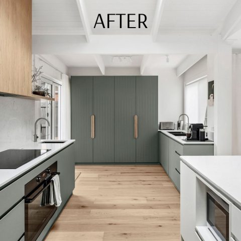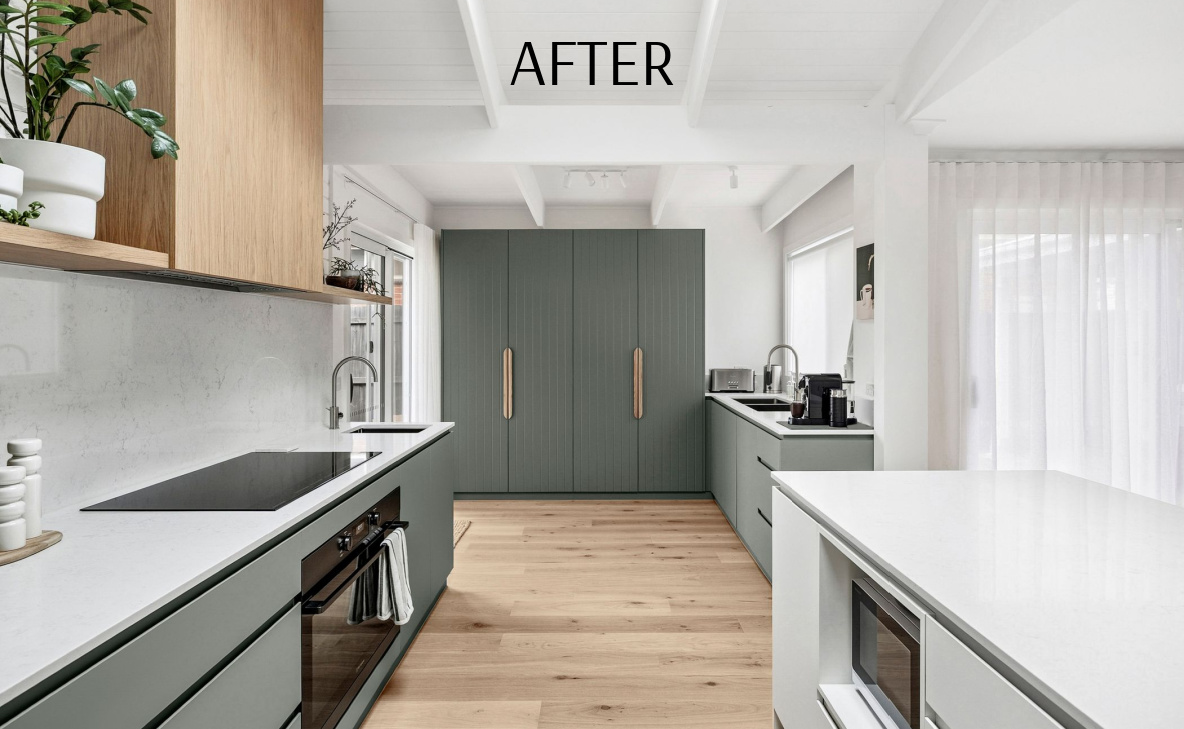 In the kitchen, Polytec Topiary Smooth laminate with vertical Calcutta profile detailing and Kethy Archive Oak handles give the pantry subtle texture and warmth. Benchtops and splashback in AC Stone Cotton Ice create a crisp, timeless finish, balanced by floating shelving and a rangehood in Polytec Boston Oak Woodmatt. The island contrasts beautifully in Polytec Blossom White, carrying through the Calcutta profile detailing for a seamless mix of muted green, natural oak, and fresh white stone.