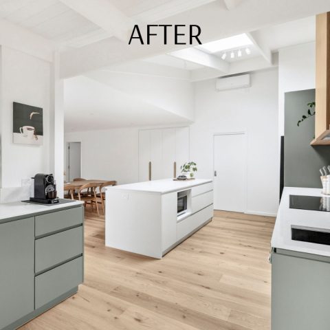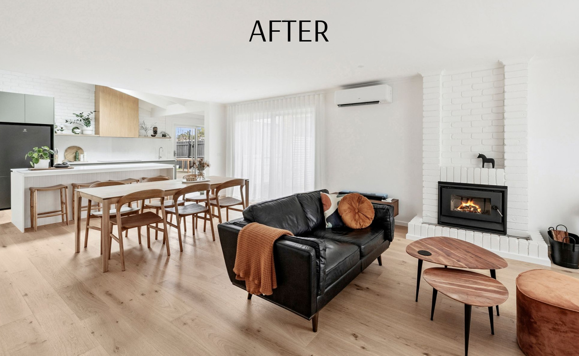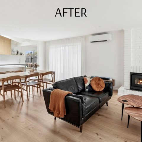 The transformation is one of light, flow, and balance. What was once a closed-in and dated home is now a modern coastal retreat, filled with natural light and anchored by a warm, timeless palette. The new layout connects the kitchen, dining, and living zones, making the home feel open and social while still retaining moments of character through the original painted brickwork and exposed ceiling details. Soft drapery and carefully layered finishes bring calm and continuity throughout, while every design decision celebrates the home’s incredible coastal setting.